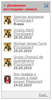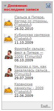 Сегодня мы запускаем новую «фишечку» нашего сайта. Это виджет «Сальса-дневники», который работает не на самом «Мамбо Трайбе», а на другом большом сайте (:)) — на Яндексе. Что такое виджеты Яндекса? Это простые в управлении и установке мини-программы. Они облегчают доступ к нужной информации, размещаясь на главной странице Яндекса. Сведениями, который отображает виджет, могут быть курсы валют, прогноз погоды или что-то ещё; а в случае с «Мамбо Трайбом» — последние записи в наших сальса-дневниках. Зачем нужна эта «фишка»? Виджет «Сальса-дневники» позволяет отслеживать появление новых записей в дневниках на «Мамбо Трайбе», не заходя на наш сайт. Это позволяет экономить ваше время и, вместе с тем, всегда быть в курсе новинок наших сальса-дневников. Как установить виджет? Это очень просто! Просто нажимаете ссылку «Установить виджет» — и он появляется на главной странице Яндекса. Использование виджета в ЖЖ Вы можете использовать виджет «Сальса-дневники» в Живом Журнале (или ином блоге), просто скопировав в него специальный код. Виджет в ЖЖ будет выглядеть примерно так: ![]() Надеемся, что новая «фишечка» вам понравится! Команда «Мамбо Трайба» |