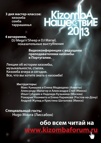 Друзья, отличные новости для любителей кизомбы!!! :) КИЗОМБА НАШЕСТВИЕ 2013 Москва, 8-10 марта 2013 НЕ ПРОПУСТИ! Все, что ты хотел узнать о кизомбе! - 3 дня мастер-классов (кизомба, семба, таррашинья, кудуро, фунана, женский стиль) - Лекции об истории и развитии кизомбы, музыкальности, стилях, кизомба вчера и сегодня. Аутентичность ... - Лекции для преподавателей об организации и структуре занятий, методике и методологии преподавания ... - Видеоконференции с ведущими преподавателями кизомбы в Португалии - 4 вечеринки с зажигательной анимацией, показательными выступлениями, многочисленными сюрпризами Инструкторы: Макс Кумашев и Елена Медведева (Алматы) Александр Малагор и Александра Стел (Минск) Илья Субачев и Надежда Кузьмина (Москва) Ромарик Нзомвита и Елена Карюкова (Ростов-на-Дону) Андрей Жулид и Кристина Шаталова (Минск) Специальный гость: Hugo Moura (Лиссабон) Музыка: DJ Mega'n'Sheep DJ Marsel' Следим за новостями! Совсем скоро более подробная информация о преподавателях, мастер-классах и вечеринках! Attachment 250 Мы на форуме: http://kizombaforum.ru/viewtopic.php?f=2&t=117 Мы в контакте: http://vk.com/kizombanashestvie Мы на фэйсбуке: http://www.facebook.com/groups/kizomba.nashestvie/ Электронная почта: kizomba.nashestvie@mail.ru Москва: Ильмира Кадырова +7 963 786 0933 Ростов-на-Дону: Ромарик Нзомвита +7 909 402 1714 Минск: Лена Магалинская +3752 955 306 64 Алматы: Макс Кумашев +7 777 391 0040 |