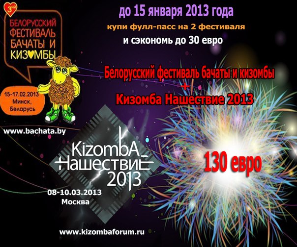 Друзья! Приближается Новый год!!! А какой новый год без сюрпризов? Один фестиваль - хорошо, а два фестиваля - еще лучше! Представляем Вам первый из нескольких комби-пассов. Купите до 15 января фулл-пассы на Кизомба Нашествие 2013 и 3-й Белорусский фестиваль бачаты и кизомбы (www.bachata.by) и сэкономьте до 30 евро! Attachment 255 |